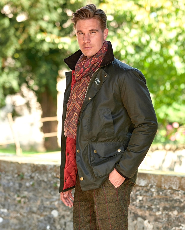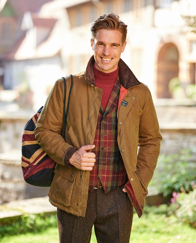 Tillhör detaljer som brun manchestertkrage, nedre påsydda fickor, bekväma fickor fram, kantdetaljer i manchester på ärmarna och den stabila tvåvägsdragkedjan i mässing framhäver det speciella utseendet på en typisk vaxjacka.